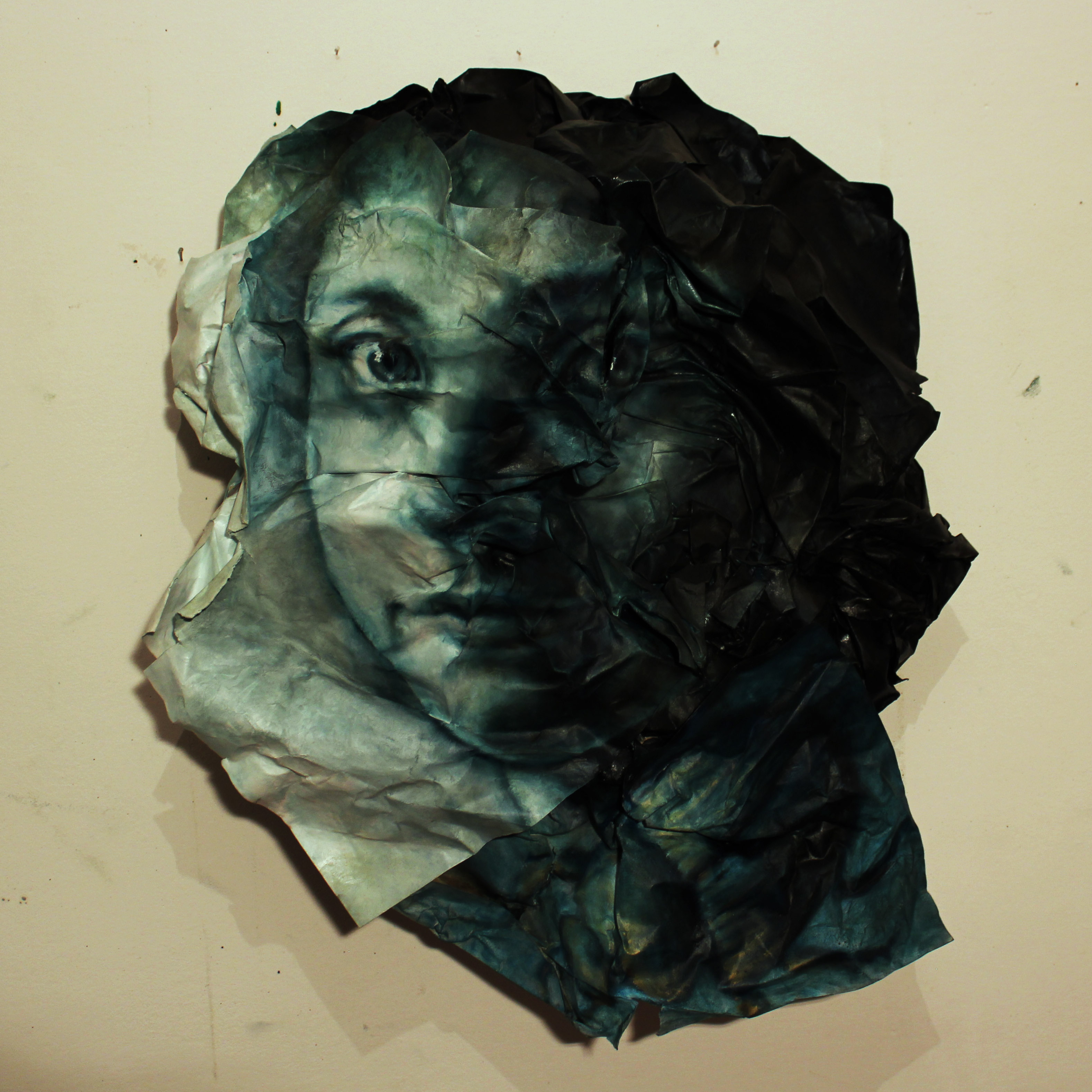 “Accade che, man mano che ci si avvicina al piano frontale dell’opera, il viso si componga. Le pieghe si allineano, i colori si accostano, e il dipinto svela il suo segreto. Al contrario, quando ci si allontana e gli si ruota attorno il soggetto si deforma, subisce menomazioni, si storpia, si imbruttisce, fino ad assumere pienamente le sembianze di un rifiuto, di uno scarto. Ed è proprio in questa particolarità, che è molto più di un semplice gioco prospettico, che si nasconde l’intuizione geniale che guida questo ciclo di opere di Emilia: dimostrare come sia sottile il limite tra un volto dipinto a regola d’arte e un’insieme confuso di segni e colori, come sia labile il confine tra la perfezione e l’insensatezza”. Queste righe di Andrea Sala, da cui vorrei partire, dicono già molto dell’ultimo progetto di Emilia Petri Dell’idea inespressa e del tutto scartabile, in cui le opere – alcune nate per vivere in coppia, altre a sè stanti – sono dipinte con la solida e tradizionale tecnica pittorica in cui l’artista ha già dato molte ottime prove, ma su un supporto cartaceo appunto spesso e spiegazzato, reso da bidimensionale (com’è il foglio piatto e passivo) a tridimensionale (pieno di emergenze e attivo), a comporre strutture complesse, deformi e solo apparentemente casuali. Il gioco è, tutto sommato, semplice: trovare come detto una ratio prospettica, per cui gli oggetti pittorici rivelino la loro unitarietà di concezione, e insieme la loro esemplare figuratività, solo da uno specifico punto di vista, distante e frontale, mentre tornino – fuori da quello – a essere ammassi pressoché informi, toccati dal colore quasi da renderli destrutturati à la maniere dei cubisti, privi di un vero soggetto identificabile.
