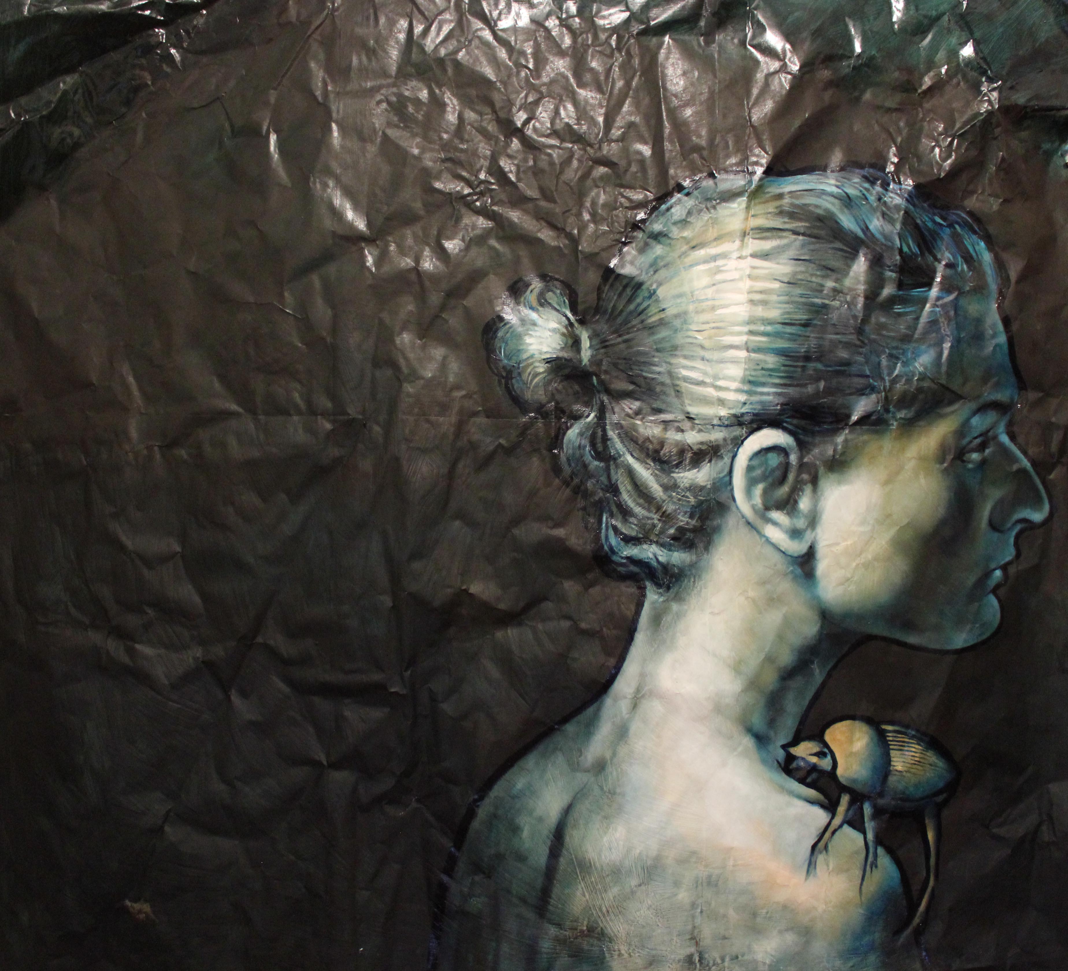 In ognuna delle opere poi ritroviamo sempre la raffigurazione dello scarabeo stercorario. Ben conosciuto e venerato dagli Egizi, pone il suo seme all’interno di una pallina di sterco, una materiale di scarto appunto, e lo fa rotolare da est a ovest in un movimento di costante rinnovamento.